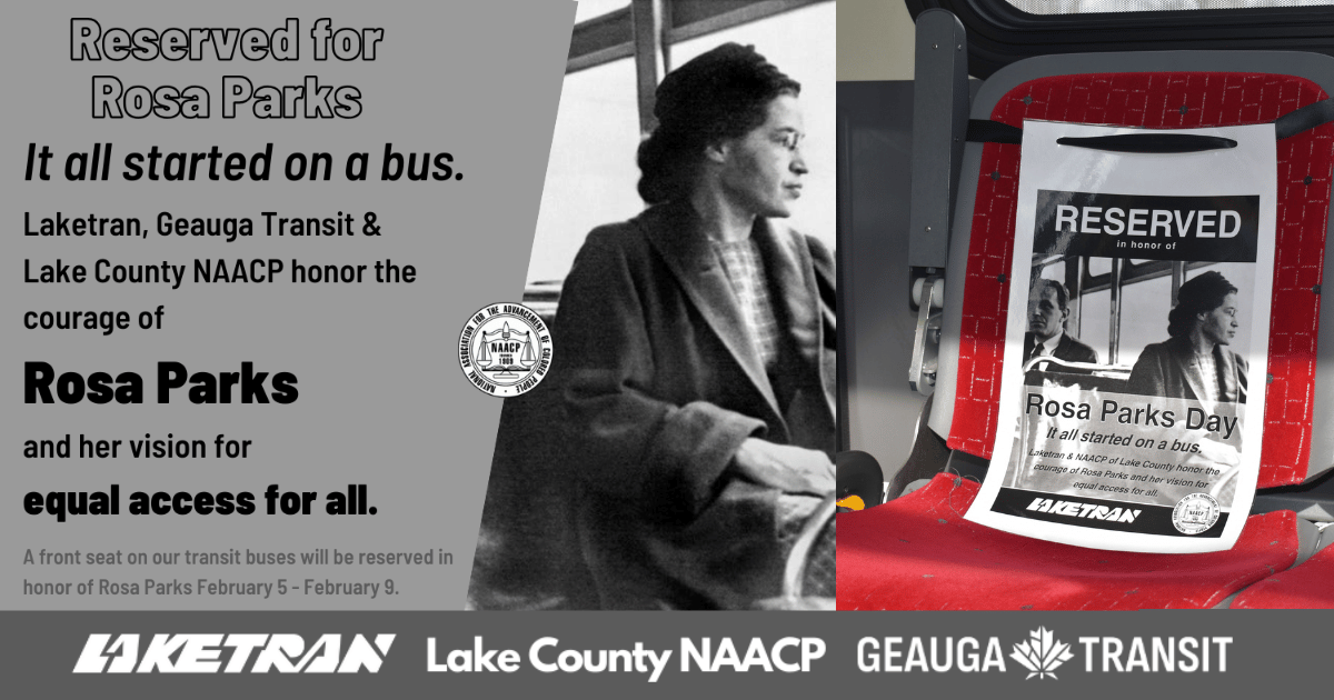 In commemoration of Rosa Parks and in conjunction with the commencement of Black History Month, Laketran and Geauga Transit will reserve the front seat on their buses from February 5 through February 9. A special commemorative sign reading, “Reserved in honor of Rosa Parks. It all started on a bus. We honor the courage of Rosa Parks and her vision for equal access for all,” will accompany the reserved seat.